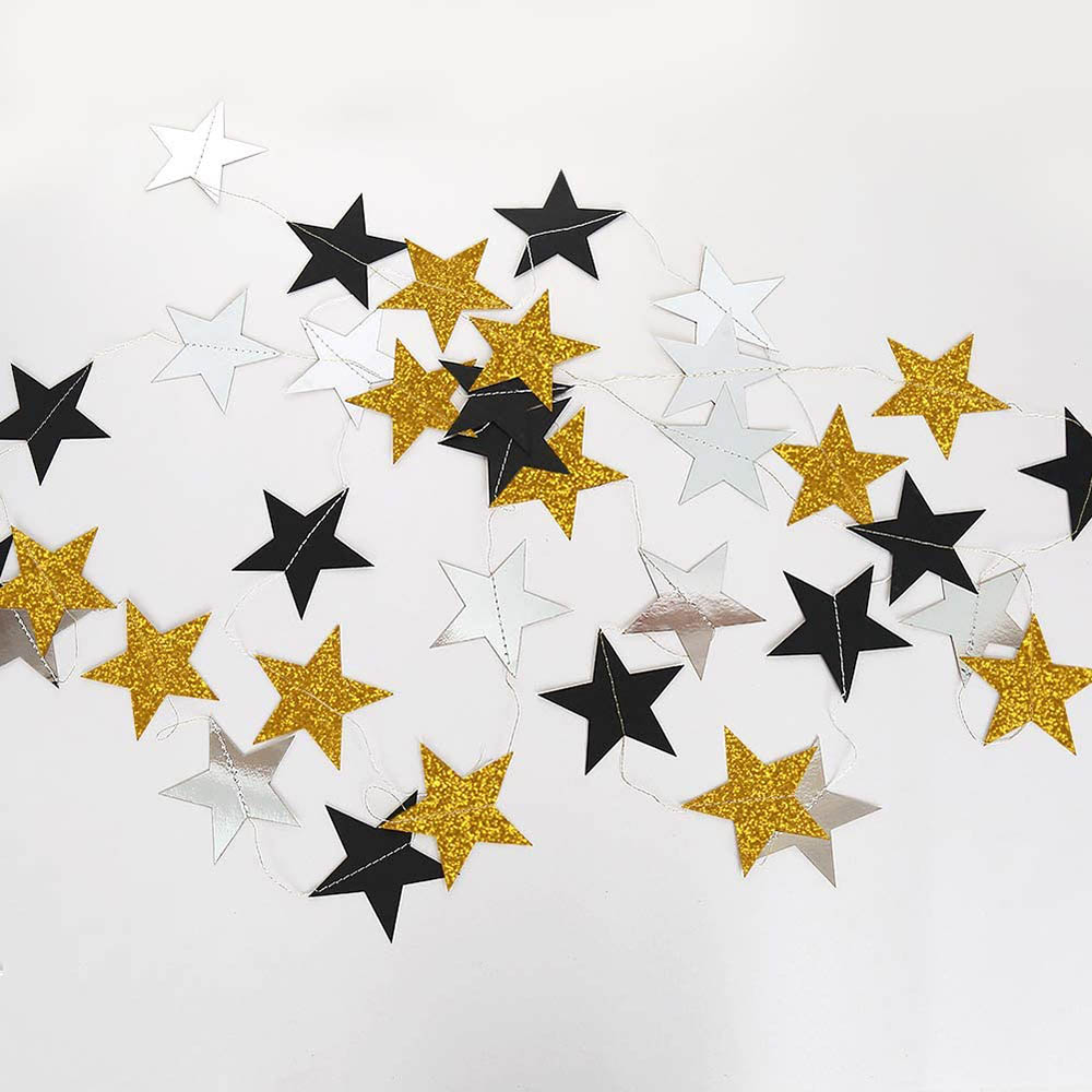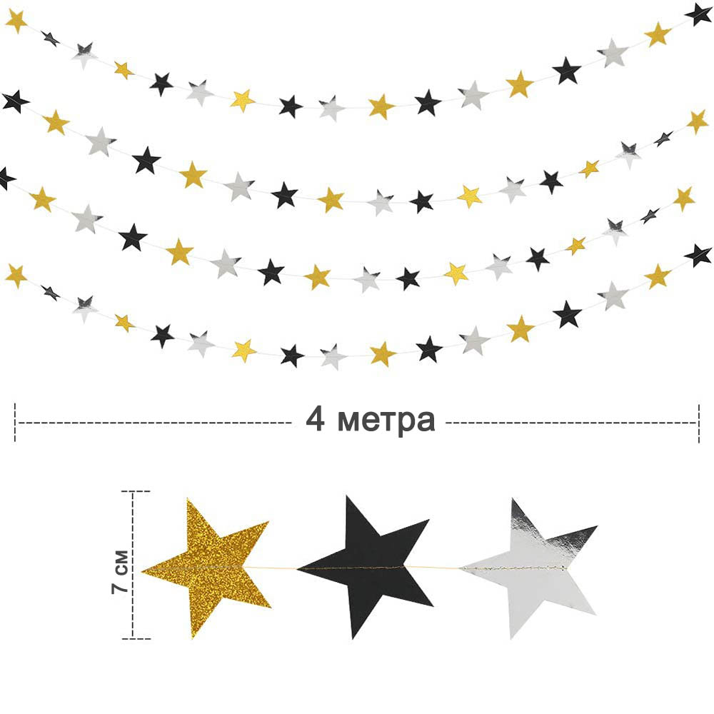 Гирлянда "Звезды" блеск 7 см х 4 м, черный+серебро+золото