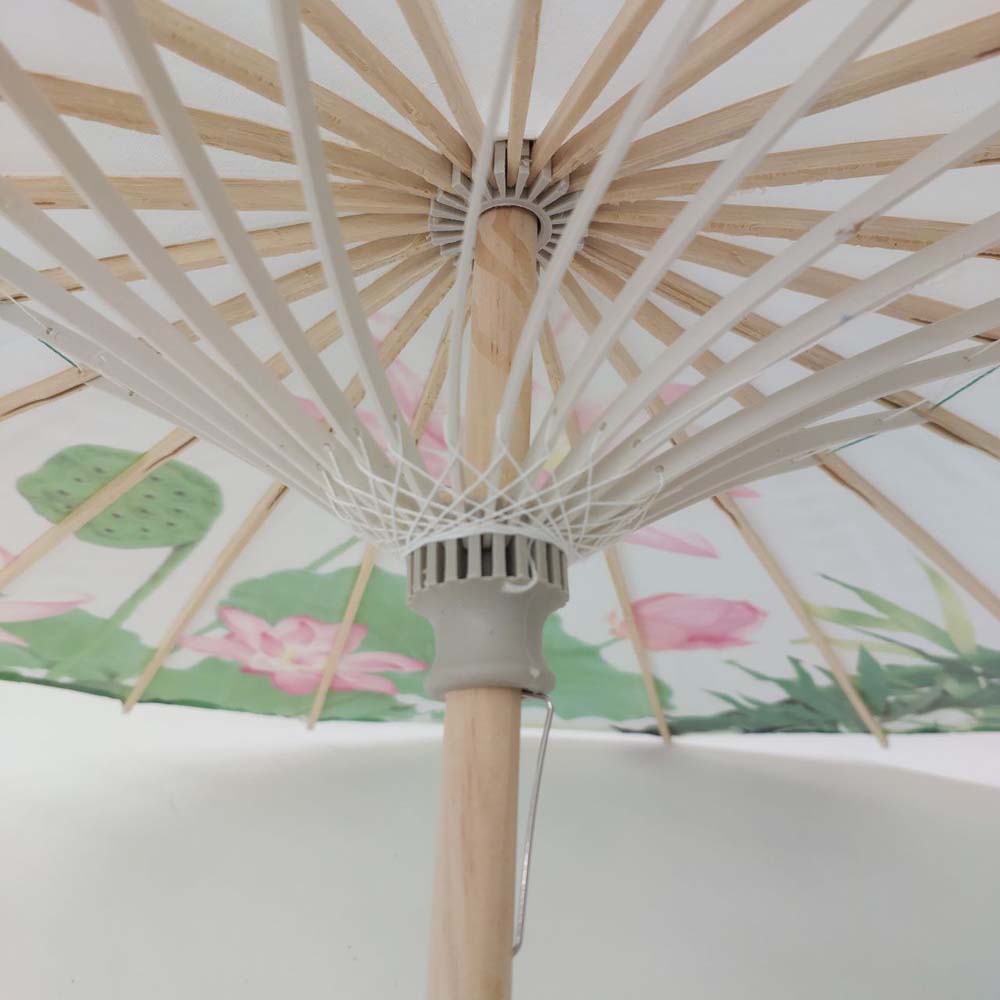 Каркас зонтика выполнен из дерева,купол зонта изготовлен из водоотталкивающего материала,который не пропускает воду.
