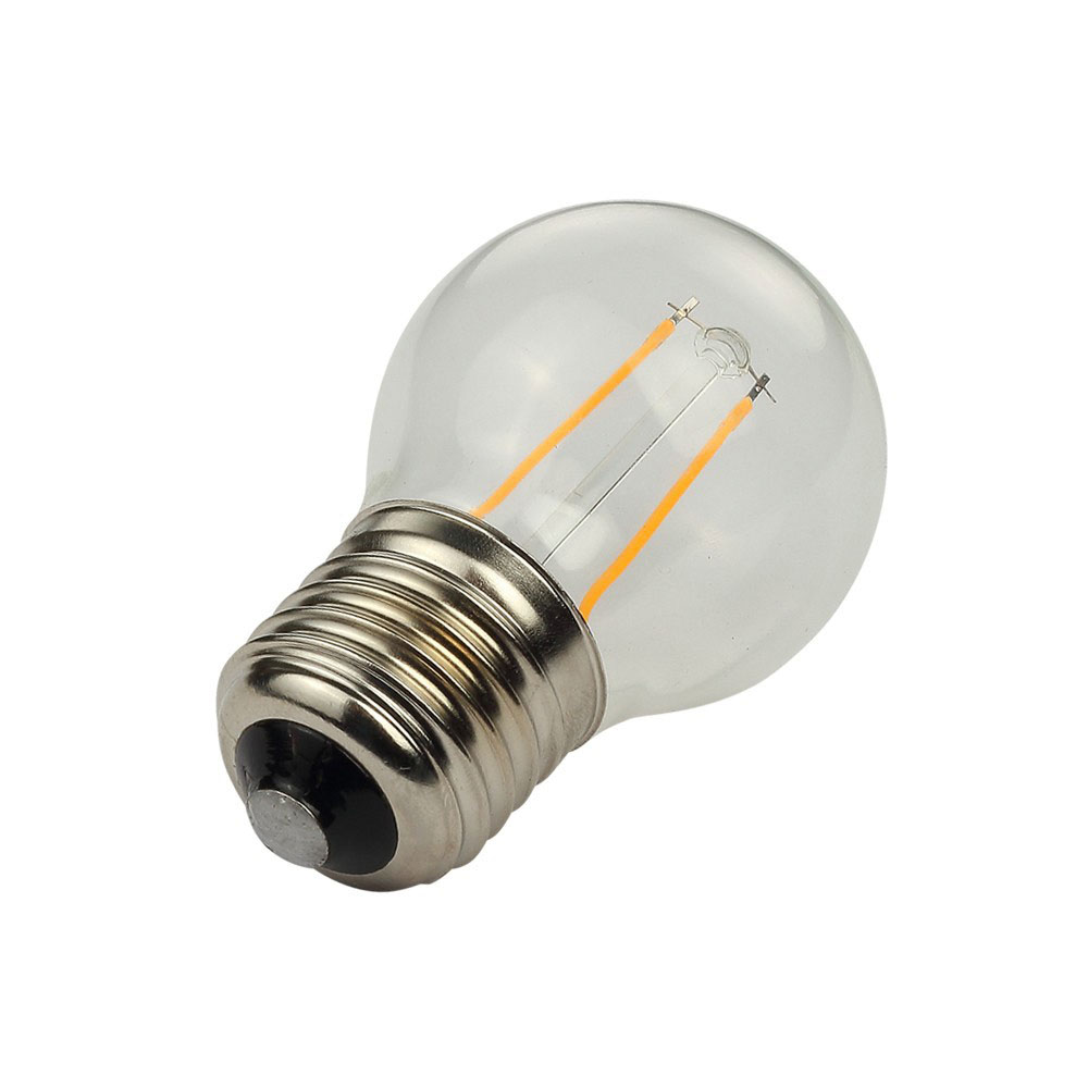 Лампа светодиодная стандарта G45 E27 с потребляемой мощностью 2 Вт. По степени интенсивности излучаемого света заменяет традиционные лампы мощностью до 25 Вт. Является декоративной и используется в гирляндах и светильниках как внутри, так и снаружи помещений. Длительность работы – до 25 тысяч часов. Не содержит вредных для экологии соединений.