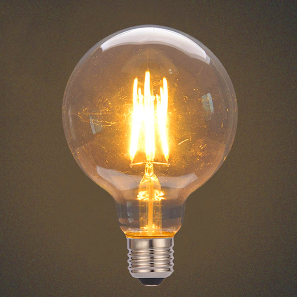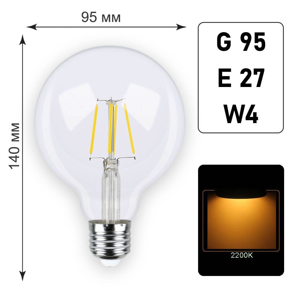 Источник света с винтажным внешним видом. Габариты лампы 80*120 мм. Устанавливается в патрон стандарта E27, потребляемая мощность 4 Вт. Высокая энергоэффективность позволяет экономить на освещении. Винтажный внешний дизайн лампы предназначен для ее установки в террасах кафе и ресторанов, стендах и в других приборах. Длительность службы, заявленная производителем – более 25 тысяч часов.