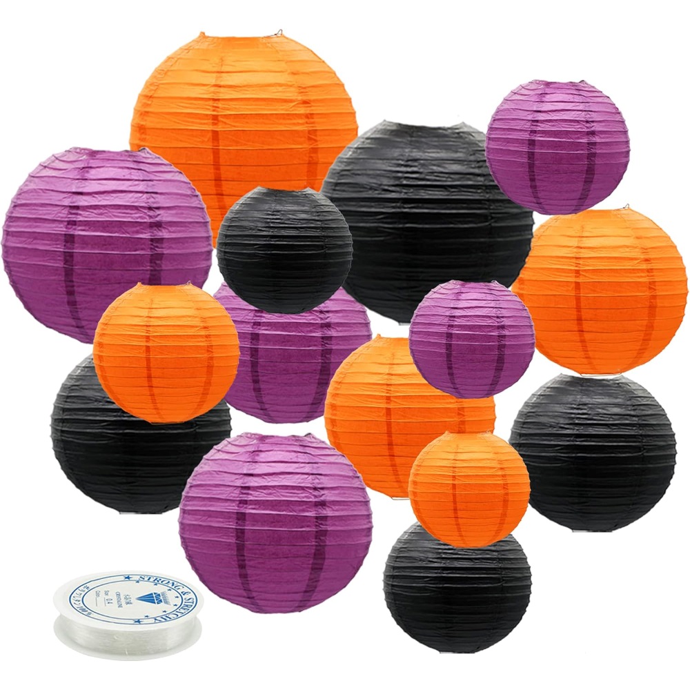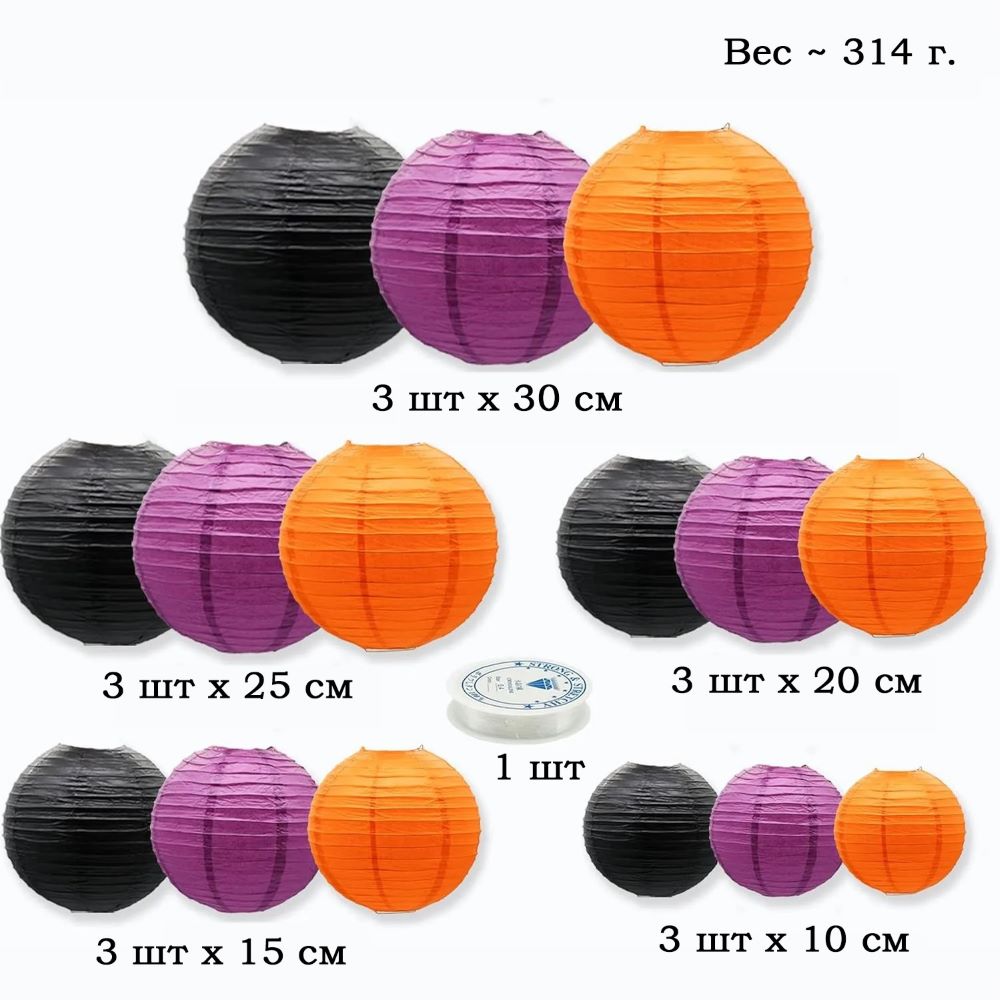 Набор подвесные фонарики 15 шт + леска, сиреневый+черный+оранжевый