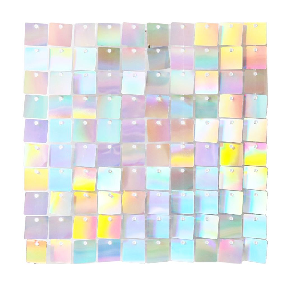 Панель с пайетками 30×30 см на гибкой пластиковой основе. Пластик прочный, хорошо гнётся и не ломается при сгибании. Пайетки переливаются при движении. Панель крепится к стенам, каркасам или соединяется с другими такими же панелями.