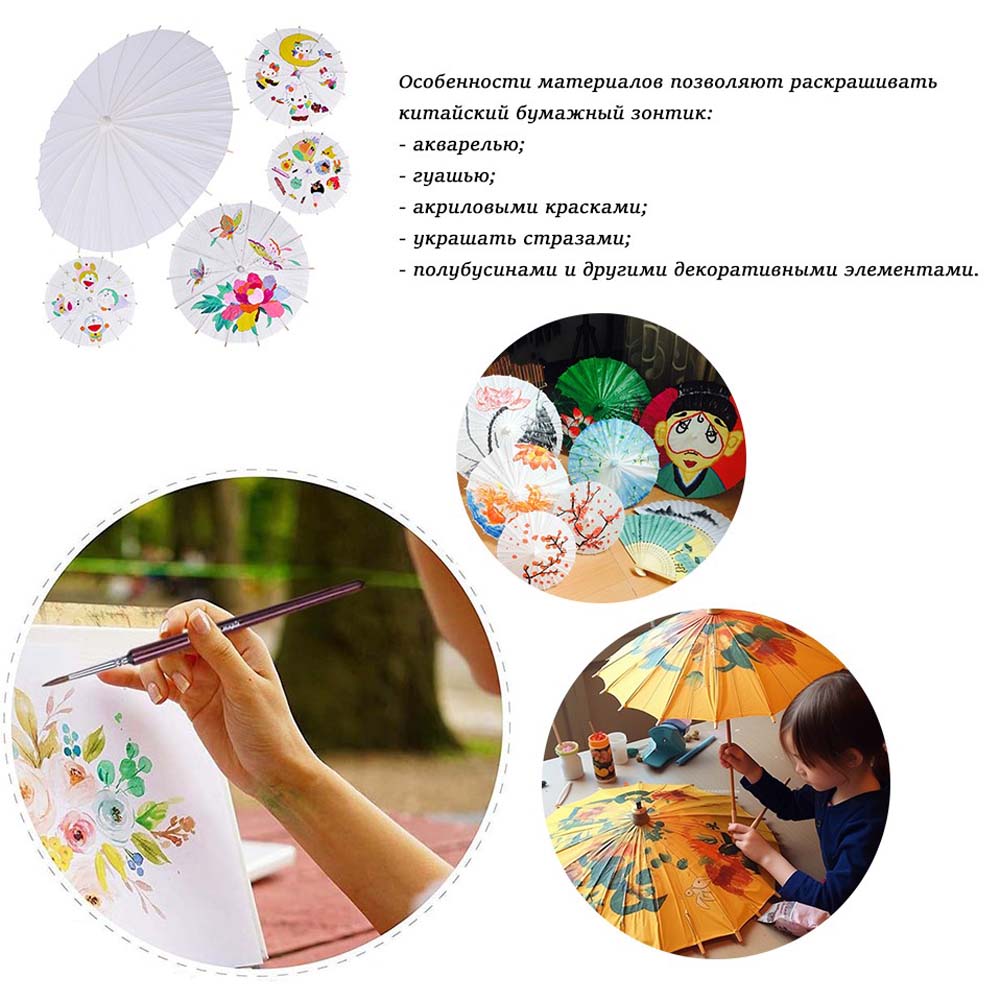 Особенности материалов позволяют раскрашивать китайский бумажный зонтик акварелью, гуашью, акриловыми красками, украшать стразами, полу бусинами и другими декоративными элементами.