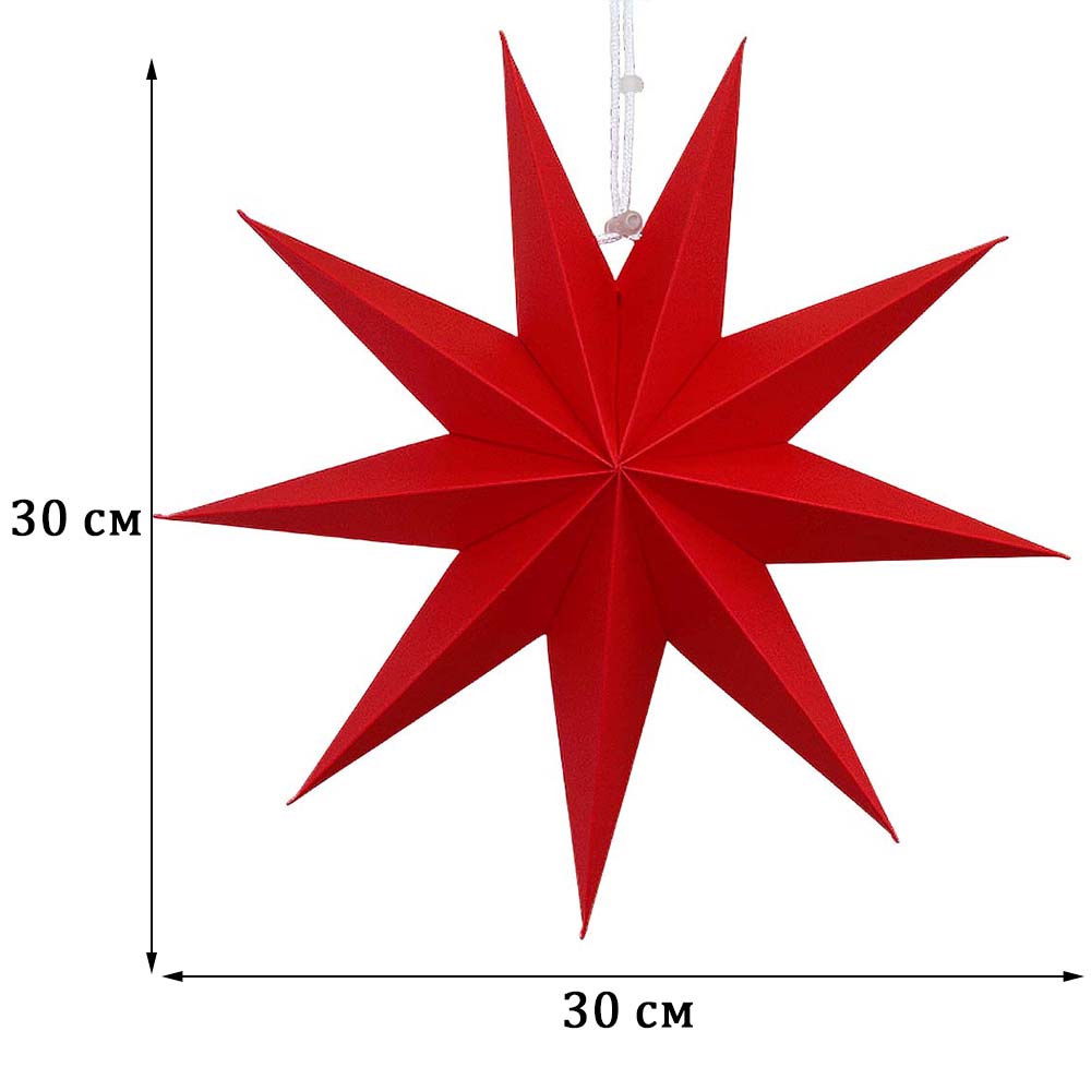 Объёмная декоративная звезда из картона диаметром 30 см с 9 лучами. Оснащена встроенным шнурком для подвешивания. Поставляется в компактном сложенном виде и быстро собирается: специальный шнурок при затягивании придаёт изделию объём и фиксирует форму. После сборки звезда остаётся устойчивой без дополнительных креплений и может использоваться многократно.