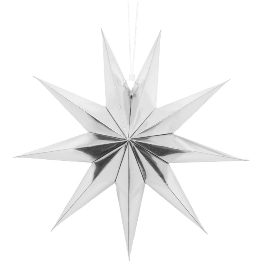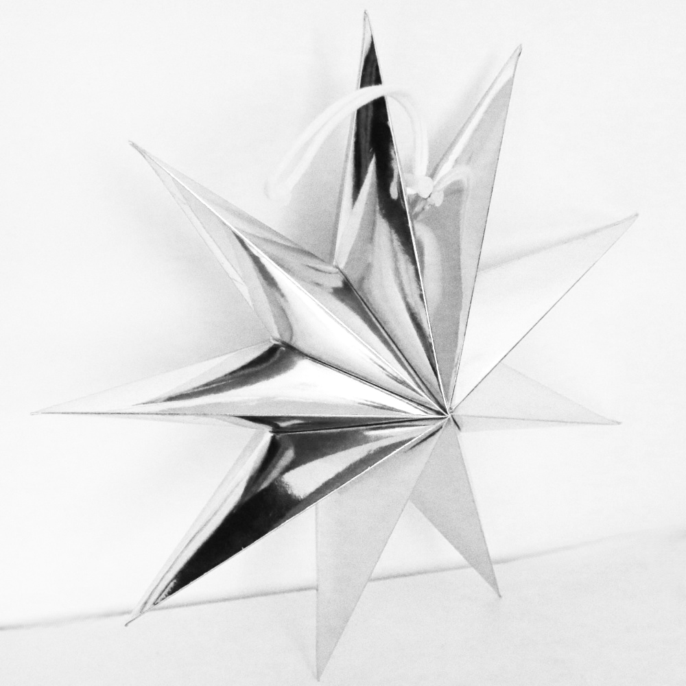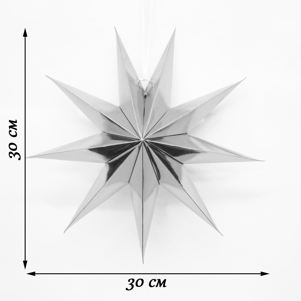 Объёмная декоративная звезда из картона диаметром 30 см с 9 лучами. Оснащена встроенным шнурком для подвешивания. Поставляется в компактном сложенном виде и быстро собирается: специальный шнурок при затягивании придаёт изделию объём и фиксирует форму. После сборки звезда остаётся устойчивой без дополнительных креплений и может использоваться многократно.