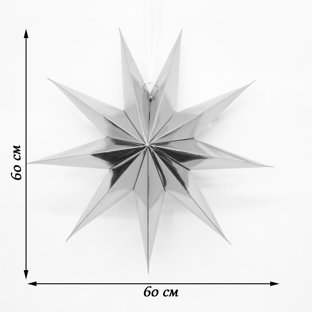 Объёмная девятиконечная звезда 60 см — декоративный элемент для интерьера и праздничного оформления. Лёгкая интерьерная звезда из картона хорошо держит форму и создаёт выразительный объём. Поставляется в сложенном виде, в комплекте шнур для фиксации объёма и подвеса.