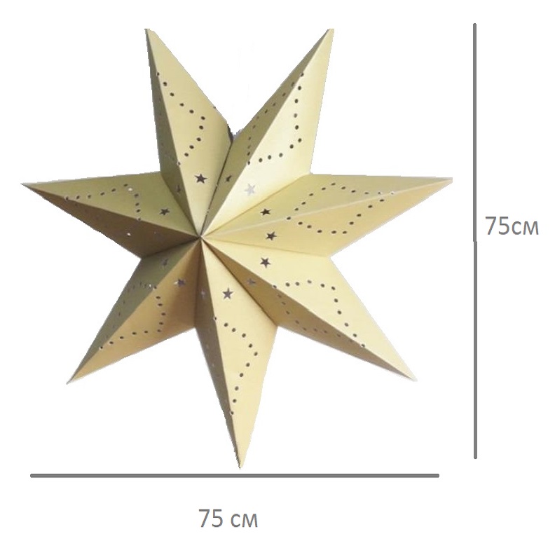 Семиконечная объемная звезда 75 см — великолепный декор из тонкого перфорированного картона. Создает красивые световые эффекты. Поставляется в сложенном виде, в комплекте шнур для фиксации объема и подвеса.